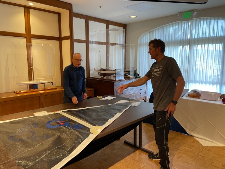 First up, measuring the new sails. For many years Jay Glazer has been a preeminent maker of racing sails. Besides being a top sailor himself, he and his wife Peasey rose to prominence as their sails won regatta after regatta. Recently he decided to retire and sold his loft in Huntington Beach to Dominic Marchal, a sailmaker from the Bay Area. We have the very first set of Marchal sails, so there was much interest in seeing them measure in.