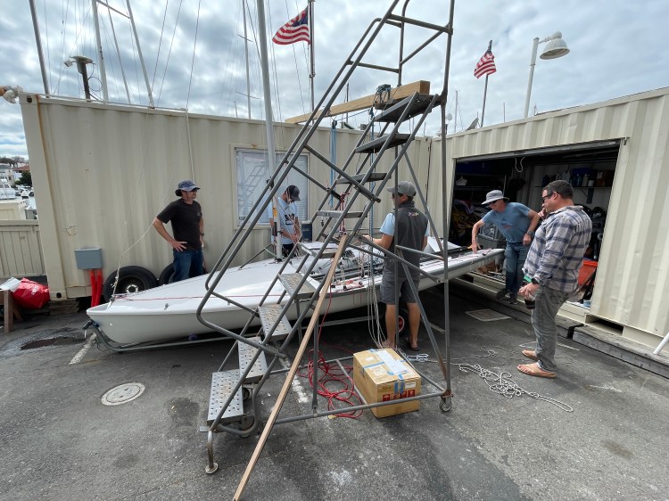 We had a few things to do to Spot, too … that’s her on the way to be launched. In no particular order – we had to rig a new spinnaker, more on that later (!) – we had to setup a new rudder, it turned out to be a collection of parts, some assembly required, deferred to tonight – and we had some miscellaneous tweaks to make, including retrieving the reef line from inside the boom; less said about that the better, but it was done.